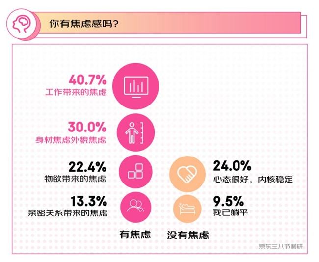 調(diào)研數(shù)據(jù)還顯示,“工作焦慮”和“身材、容貌焦慮”是當(dāng)代女性的兩大焦慮點(diǎn)。