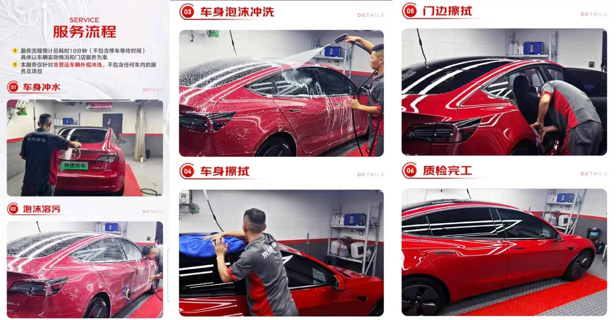 具體來說,京東養(yǎng)車將整個(gè)洗車流程分為車身沖水、泡沫溶污、車身泡沫沖洗、車身擦拭、門邊擦拭、質(zhì)檢完工六個(gè)步驟,每個(gè)步驟都有明確的操作細(xì)則、注意事項(xiàng)及質(zhì)檢標(biāo)準(zhǔn)。整套流程下來僅需10分鐘,大大節(jié)約了車主的時(shí)間,且整個(gè)洗車過程只使用1款洗車液,降低了化學(xué)物質(zhì)的排放,也減少了環(huán)境污染。京東養(yǎng)車還要求各門店統(tǒng)一毛巾標(biāo)準(zhǔn),分區(qū)、分毛巾擦拭,確保洗車過程中的清潔效果,并對(duì)全員洗美技師提出了學(xué)習(xí)快洗標(biāo)準(zhǔn)流程和參加考試的要求,力求為用戶提供高效、便捷的洗車服務(wù)。