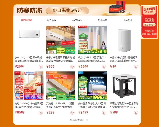 當前,全國各地普遍開始大幅度降溫,企業(yè)的防寒防凍物資采購需求也在迅速增長。要做好冬季企業(yè)防寒防凍工作,涉及大量專業(yè)場景物資,“企業(yè)會員日”從“設(shè)備防凍”和“員工防寒”兩大需求出發(fā),提供了包括室內(nèi)保暖、戶外防寒、食飲滋補、防寒藥品等多元化場景的一站式商品,企業(yè)客戶可根據(jù)應(yīng)用場景,快速篩選對應(yīng)的防寒防凍物資。