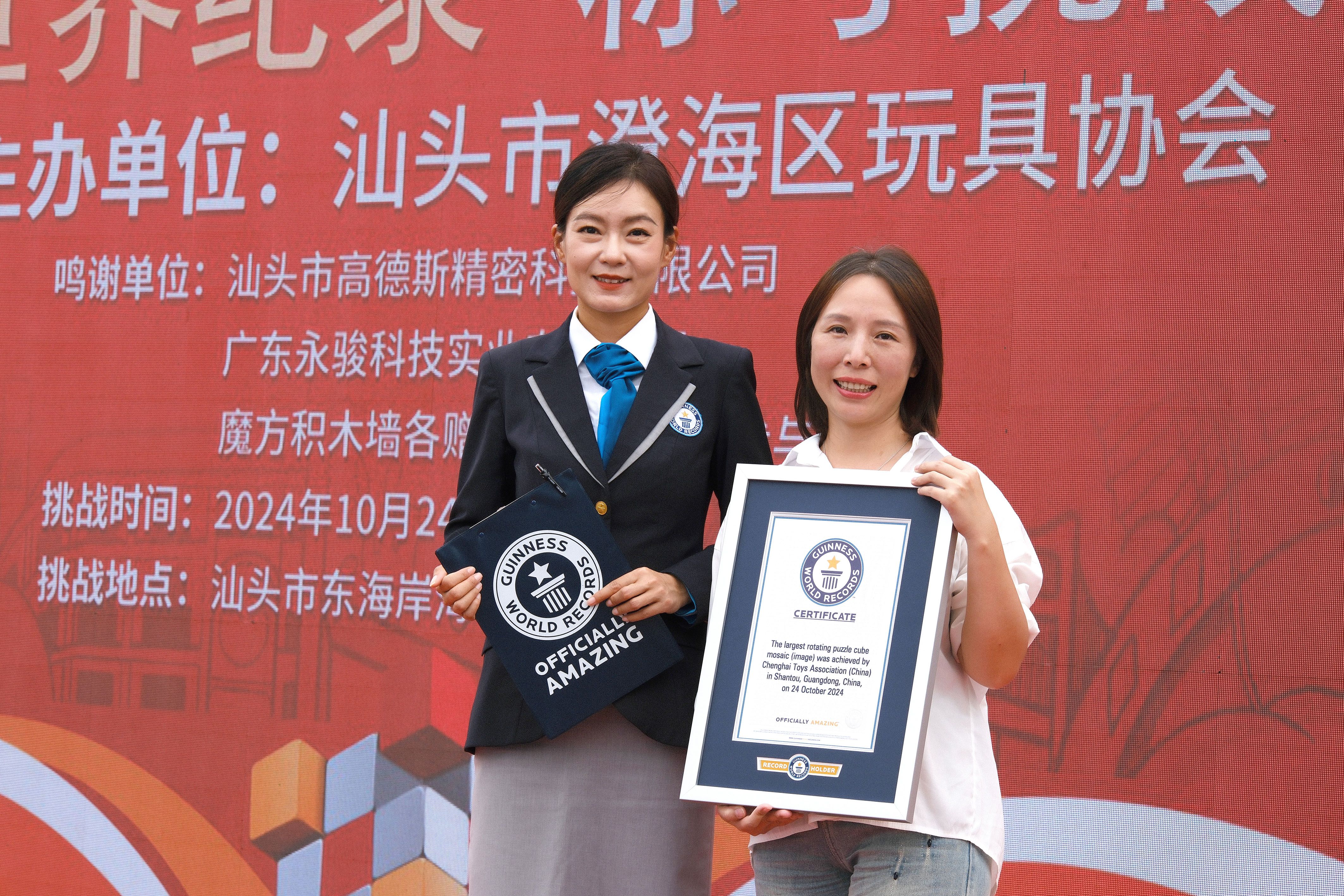 10月24日下午,在第23屆玩博會(huì)即將開(kāi)幕之際,在汕頭海明公園東南側(cè),由109000顆三階魔方精心拼接而成,長(zhǎng)達(dá)123米、高度近3米的魔方墻,成功刷新“最大的魔方組成的圖案”吉尼斯世界紀(jì)錄。