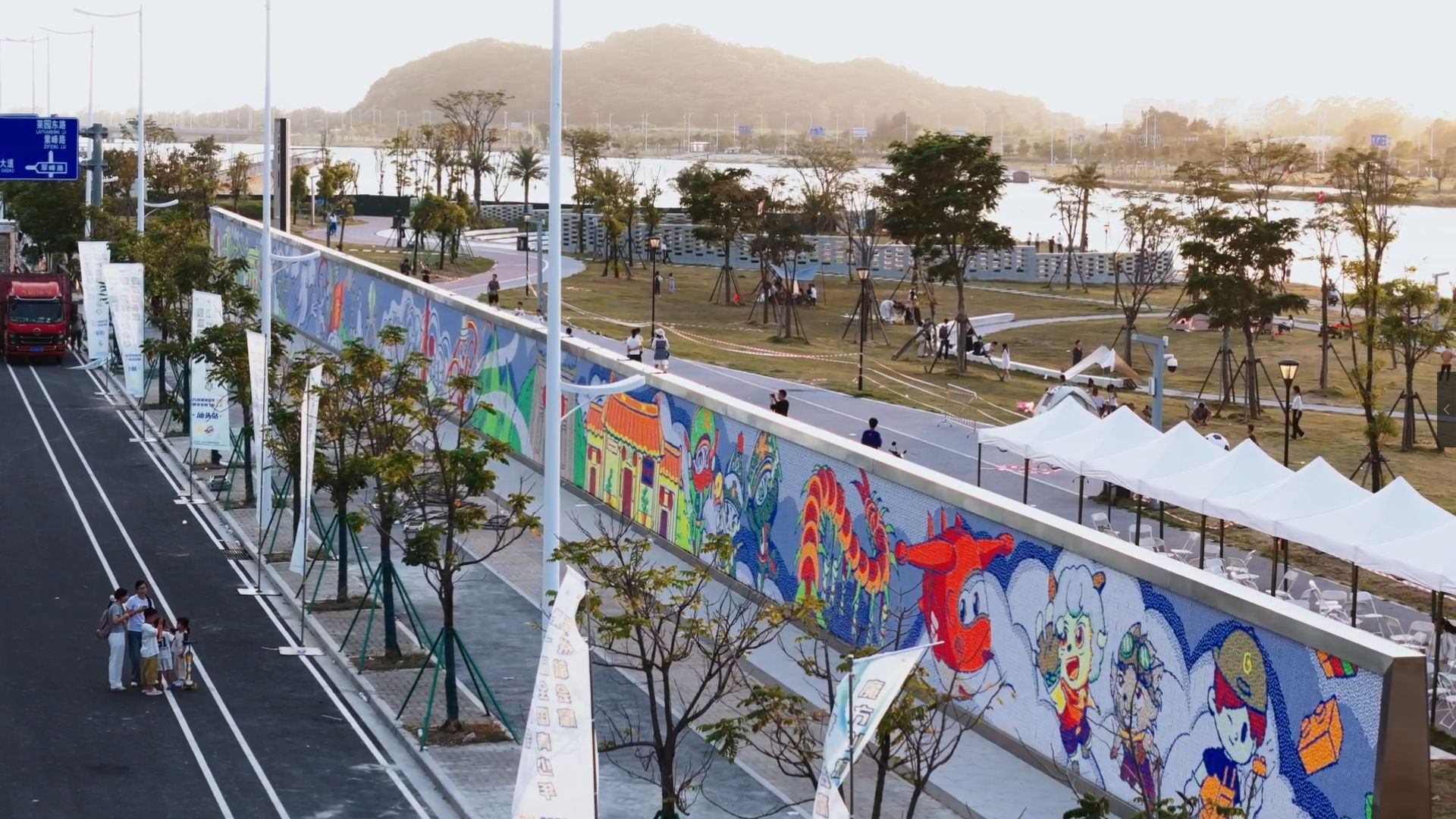這百余米的畫(huà)卷生動(dòng)展現(xiàn)了汕頭多處著名旅游景點(diǎn)、歷史建筑、特色風(fēng)俗,北回歸線標(biāo)志塔、南澳燈塔、澄海冠山書(shū)院等地標(biāo)性景點(diǎn)躍然墻上,紅頭船、英歌舞、蜈蚣舞等潮汕經(jīng)典元素栩栩如生,更有“超級(jí)飛俠”“喜羊羊”等廣受歡迎的IP角色穿插其中,為孩子們帶來(lái)無(wú)限驚喜。魔方積木墻背面則是用積木拼制了80家知名企業(yè)的LOGO,向游客們展示澄海玩具產(chǎn)業(yè)品牌建設(shè)的成果。