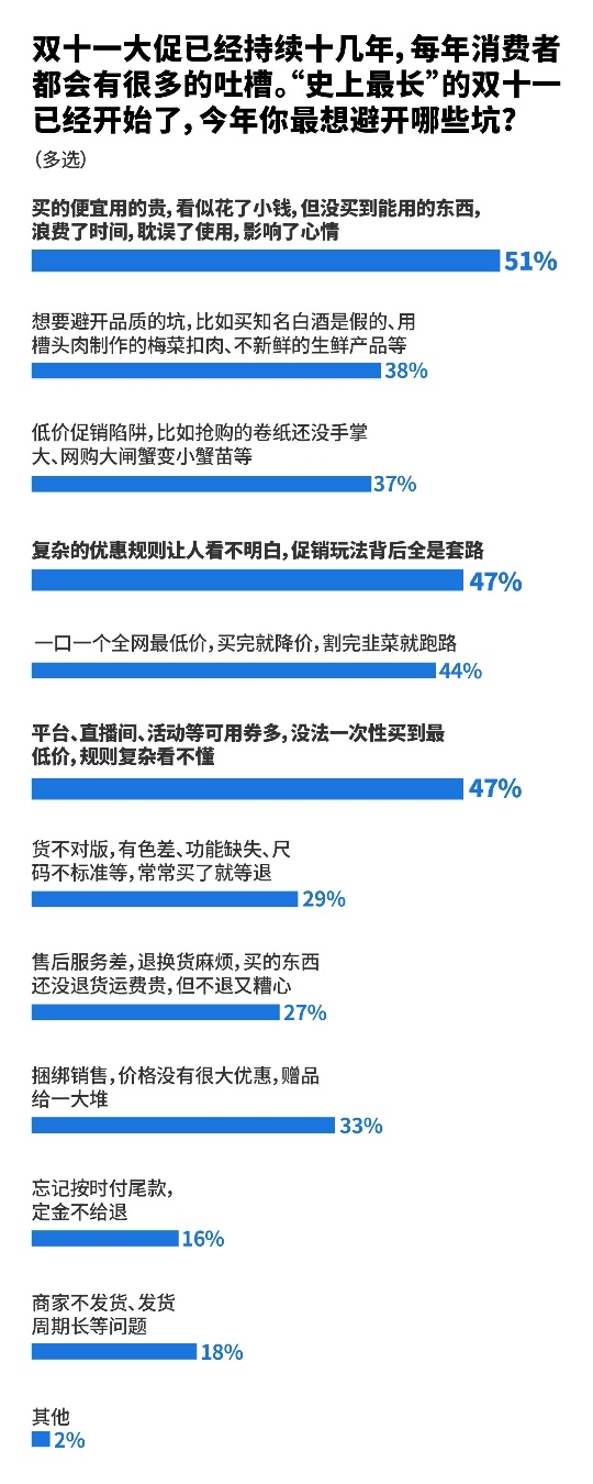 面對(duì)“史上最長(zhǎng)”雙十一,大部分消費(fèi)者表示,一年兩次大促已經(jīng)成為購(gòu)物的慣性動(dòng)作,買還是要買的,只是有話要說:簡(jiǎn)單清楚做大促、誠(chéng)意福利給足成為最強(qiáng)呼聲。