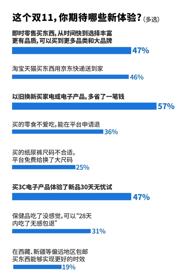 在雙十一新服務(wù)新體驗(yàn)方面,有57%的人選擇省心省錢的一站式以舊換新服務(wù),47%的人期待配送快、選擇豐富、更有品質(zhì)的即時(shí)零售服務(wù),還有47%期待體驗(yàn)3C電子產(chǎn)品新品30天無憂試用。此外,零食“不愛吃就退款”、保健品“28天內(nèi)吃了無感包退”等更具突破性的服務(wù)體驗(yàn)也讓消費(fèi)者格外期待。