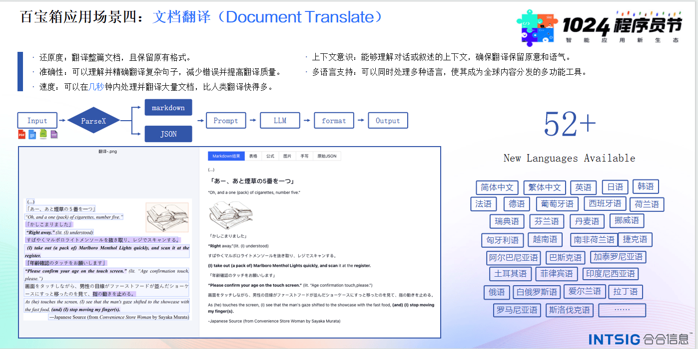 近期,第五屆長(zhǎng)沙·中國(guó)1024程序員節(jié)在湖南長(zhǎng)沙舉行。大會(huì)由湖南省工業(yè)和信息化廳、湖南湘江新區(qū)管理委員會(huì)、長(zhǎng)沙市工業(yè)和信息化局、長(zhǎng)沙信息產(chǎn)業(yè)園管委會(huì)和 CSDN 聯(lián)合打造。大會(huì)期間,合合信息面向廣大開(kāi)發(fā)者,開(kāi)放智能文檔處理“百寶箱”系列產(chǎn)品(簡(jiǎn)稱“百寶箱”)免費(fèi)體驗(yàn)?!鞍賹毾洹备采w文檔處理流程多節(jié)點(diǎn),支持批量、高效、準(zhǔn)確解析多種版式的文檔材料,解決文檔解析精度低、解析效果評(píng)估難和大模型幻覺(jué)等問(wèn)題,助力技術(shù)人員實(shí)現(xiàn)個(gè)性化、高效率的文檔類應(yīng)用開(kāi)發(fā)工作。