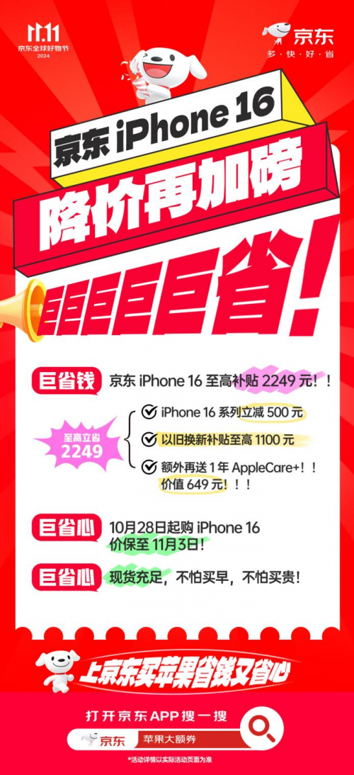 10月31日晚8點(diǎn),京東11.11正式開場,補(bǔ)貼再加磅!對于果粉來說現(xiàn)在正是入手iPhone 16系列的最佳時機(jī)。具體來看,購買iPhone 16系列至高補(bǔ)貼2249元,即日起購iPhone 16可價保至11月3日,而且還都是現(xiàn)貨開售,下單就發(fā)貨不用苦等預(yù)售。感興趣的果粉,現(xiàn)在打開京東APP搜索“蘋果大額券”即可直達(dá)活動會場。