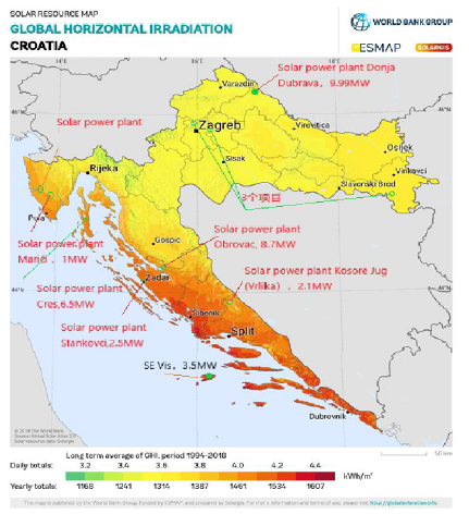 3.太陽能方面,克羅地亞南部亞得里亞海沿岸地區(qū)的太陽能資源最為優(yōu)越,向北逐漸減少。從時間分布來看,夏季日照時間與輻射量均最高,7月太陽能資源最強(部分地方為6月),冬季最低。截至2021年,克羅地亞已建成投運100MW的光伏電站,預計可開發(fā)容量為6.8GW,其中5.3GW為地面光伏電站,1.5GW為屋頂光伏。