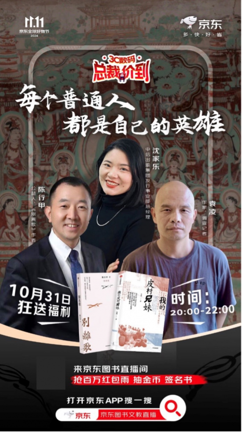10月31日晚8點(diǎn),中信出版集團(tuán)發(fā)行事業(yè)部總經(jīng)理沈家樂;公益人、《別離歌》作者陳行甲;作家、調(diào)查記者袁凌將來到京東圖書文教直播間,與廣大觀眾朋友一起分享《別離歌》和《我的皮村兄妹》中屬于普通人的英雄故事。直播期間,還將為觀眾帶來百萬紅包雨、金幣和簽名書抽獎(jiǎng)大放送等福利,感興趣的朋友記得打開京東APP搜索“京東圖書文教直播”,進(jìn)入京東圖書文教直播間預(yù)約開播。