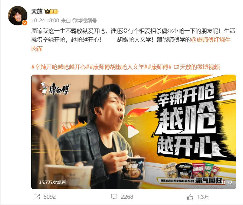 在創(chuàng)新之余,康師傅同樣也重視經(jīng)典產(chǎn)品的價(jià)值。近期,康師傅對(duì)黑胡椒牛排味面和白胡椒豬肚雞面進(jìn)行了升級(jí)回歸。這兩款經(jīng)典產(chǎn)品通過配方升級(jí)和還原上市初期的包裝設(shè)計(jì),再次喚起了消費(fèi)者的懷舊情感,也迎合了年輕消費(fèi)者對(duì)復(fù)古潮流和獨(dú)特風(fēng)味的興趣。為了更好地傳遞“霸氣回歸”的概念,康師傅特別邀請(qǐng)了喜人——天放拍攝“嗆人” TVC,以幽默詼諧的方式詮釋產(chǎn)品的個(gè)性和魅力。