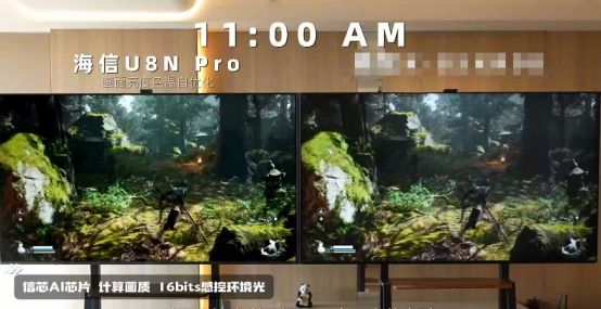 游戲場景中的AI畫質(zhì)調(diào)校同樣出色。比如在中午強烈光線干擾下,用海信電視U8玩游戲,游戲畫面不僅色彩更飽滿、對比度更高,而且兼顧了畫面流暢度。這也解釋了為何《黑神話:悟空》選擇與海信電視合作,對游戲進行專項畫質(zhì)調(diào)校,一方面游戲畫面的色彩與暗部細節(jié)都獲得了優(yōu)化,林木蒼翠,洞府幽深,帶來十足的真實感與層次感,另一方面整體環(huán)境的光影呈現(xiàn),更加貼近中式美學氛圍。