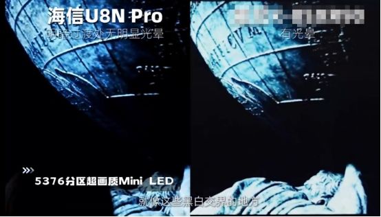 視頻中兩臺電視同時播放電影大片,海信電視U8畫面黑白交界處無明顯光暈,在明暗交界處顏色保持很高的統(tǒng)一性,因此影片暗場觀影細節(jié)更加清楚。反觀價格更貴的國外S品牌,同樣畫面明暗交界處細節(jié)處理則略顯不足,容易出現(xiàn)光暈和溢光現(xiàn)象。究其原因,高分區(qū)前提下的精準控光,才是超畫質(zhì)Mini LED的基本素養(yǎng)。