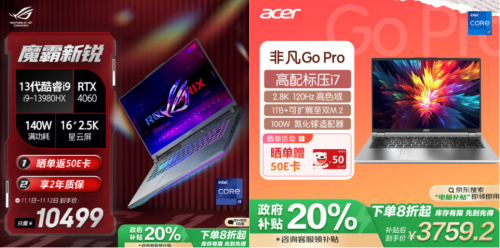以ROG魔霸新銳2024款游戲本為例,原價(jià)10495元的140W滿功耗、高性能游戲本產(chǎn)品,在京東領(lǐng)取政府補(bǔ)貼立減2000元,雙11到手價(jià)只要8495元,相當(dāng)于打了八折;宏碁非凡Go Pro 14英寸筆記本電腦也一樣,原價(jià)4699元的大存儲(chǔ)高刷全能本,領(lǐng)取政府補(bǔ)貼后到手價(jià)僅需3759.2元,曬單還贈(zèng)送50E卡。