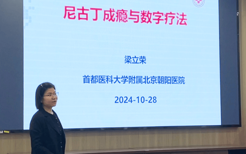 研討環(huán)節(jié)中,北京朝陽醫(yī)院臨床流行病學(xué)研究室及煙草依賴治療研究室主任、北京朝陽醫(yī)院戒煙門診負(fù)責(zé)人梁立榮圍繞“尼古丁成癮與數(shù)字療法”主題,從尼古丁成癮機(jī)制與干預(yù)策略、數(shù)字戒煙干預(yù)模式構(gòu)建、數(shù)字控?zé)熢O(shè)備、控-戒干預(yù)模式四個(gè)方面進(jìn)行了分享。
