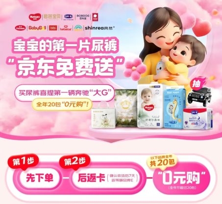 在尿褲免費送公益活動會場,下單參與活動的尿褲商品,在確認(rèn)收貨7天后,就可以返還與下單實付金額等值的京東品牌E卡,每位用戶全年可免費領(lǐng)取20包尿褲,平均為每戶家庭降低超千元育兒成本。