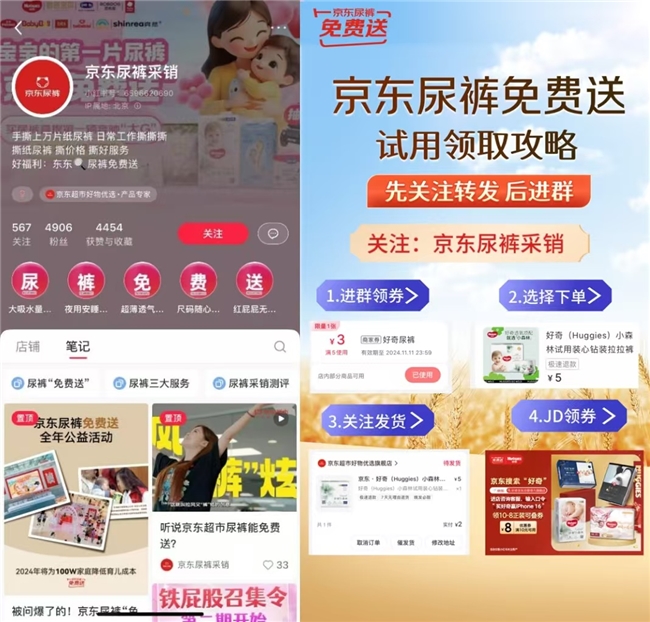 同時,參與“京東尿褲采銷”小紅書賬號發(fā)起的小紅書種草、群試用裝派發(fā)等線上互動活動,同樣可以獲得更多免費送機會。用戶關(guān)注京東尿褲采銷后,可進群領(lǐng)券,下單并發(fā)貨后,還送尿褲優(yōu)惠券。