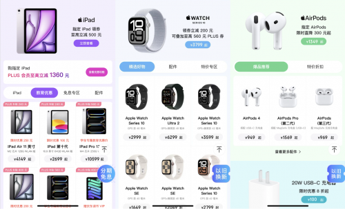 此外,iPad、Apple Watch、AirPods等也有優(yōu)惠可享。其中,針對(duì)iPad推出了指定iPad至高立減500元,PLUS會(huì)員至高立減1360元福利,iPad mini第六代低至3499元、M4芯片的iPad Pro 11英寸版到手低至8499元起,教育優(yōu)惠到手價(jià)低至8099元。Apple Watch領(lǐng)券立減200元,還可疊加至高560元PLUS優(yōu)惠券,Apple Watch S10領(lǐng)券立減200元,PLUS用戶領(lǐng)240元優(yōu)惠券疊加到手2559元起。AirPods 4代(支持主動(dòng)降噪)PLUS會(huì)員可疊加120元優(yōu)惠券,到手低至1241元起。還有20W直插充電頭限時(shí)直降,湊單后到手價(jià)為100元、App Store 充值卡11.11限時(shí)優(yōu)惠權(quán)益包只要6.9元、Apple iCloud +權(quán)益包到手價(jià)64.7元,包含12個(gè)月的iCloud+50GB和App Store充值卡券,為你的數(shù)據(jù)存儲(chǔ)和應(yīng)用購買提供了更多便利和優(yōu)惠。