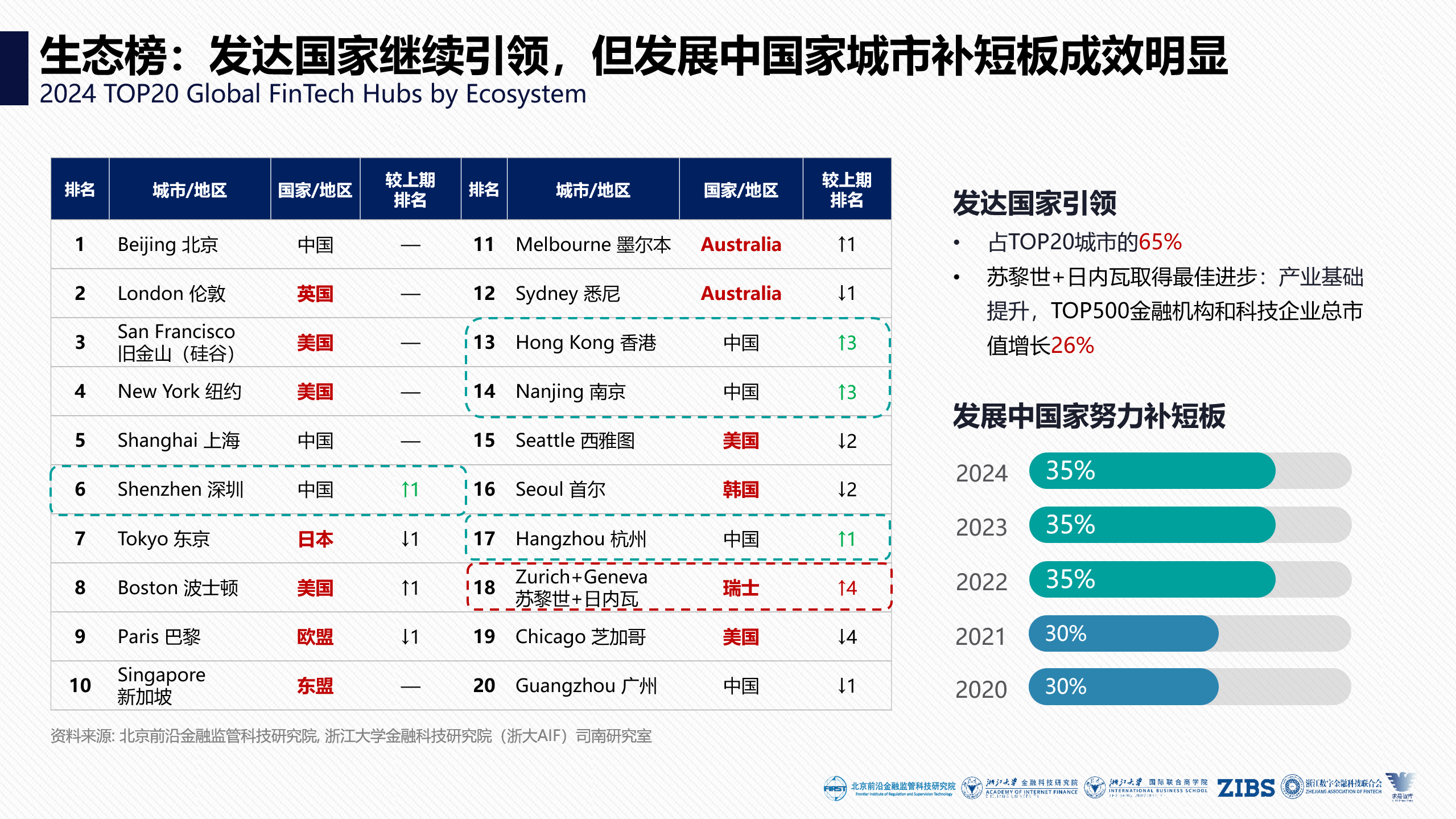 從金融科技生態(tài)來看,《報(bào)告》顯示,發(fā)達(dá)國家城市憑借其更優(yōu)越的金融與科技環(huán)境、高端人才積累、政府監(jiān)管經(jīng)驗(yàn)繼續(xù)保持引領(lǐng)之姿,在TOP20城市中占據(jù)65%的席位。其中,蘇黎世和日內(nèi)瓦地區(qū)進(jìn)步最為明顯(前進(jìn)4名)。同時(shí),在全球城市極力彌補(bǔ)自身金融科技短板、跨越當(dāng)前金融科技發(fā)展難題的背景下,已有越來越多的發(fā)展中國家向發(fā)達(dá)國家學(xué)習(xí)監(jiān)管、研發(fā)、人才培養(yǎng)等生態(tài)建設(shè)經(jīng)驗(yàn),其補(bǔ)短板成效在本期生態(tài)排名中得到了充分體現(xiàn),不僅今年7座發(fā)展中國家城市進(jìn)入生態(tài)TOP20,而且這一占比從2020年的20%穩(wěn)步上升至35%。