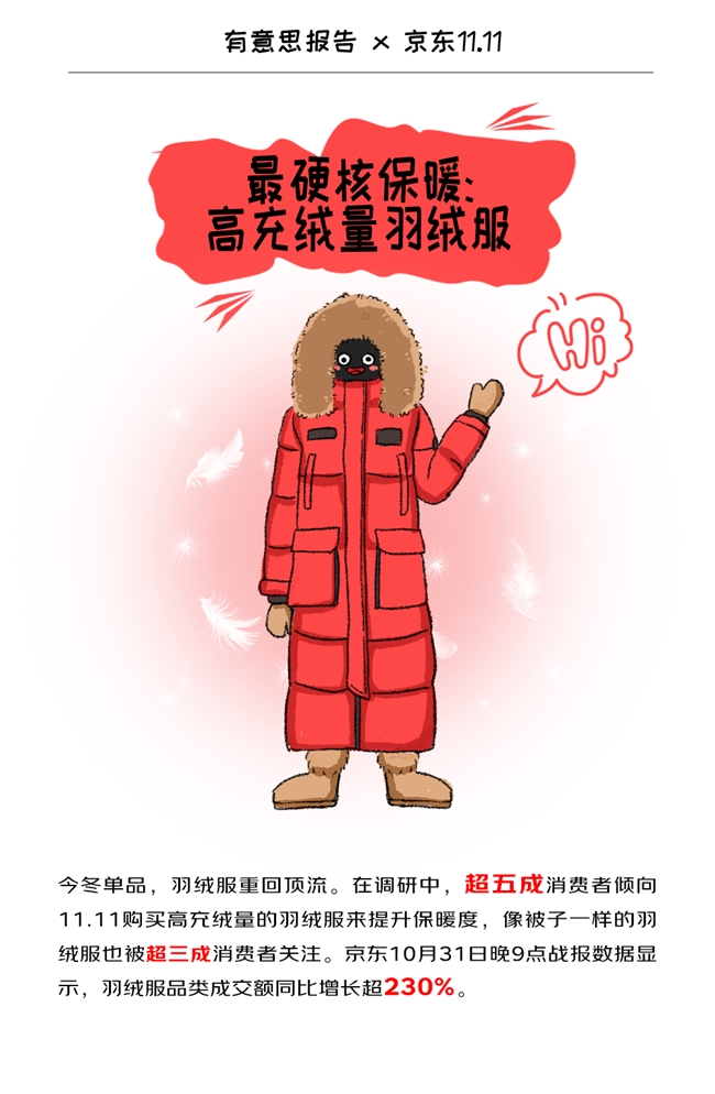 今冬單品頂流,羽絨服當(dāng)之無愧。從輕薄短款到寬松肥大的被子款,從簡約純色到個性印花,從舒適貼身內(nèi)穿到硬核防寒外穿,多樣化設(shè)計風(fēng)格的羽絨服重回保暖市場C位,奪回曾被沖鋒衣、軍大衣、搖粒絨等搶走的市場。有超過51%的消費(fèi)者在調(diào)研中表示,11.11期間購買了羽絨服。京東10月31日晚9點(diǎn)戰(zhàn)報數(shù)據(jù)顯示,羽絨服品類成交額同比增長超過230%。