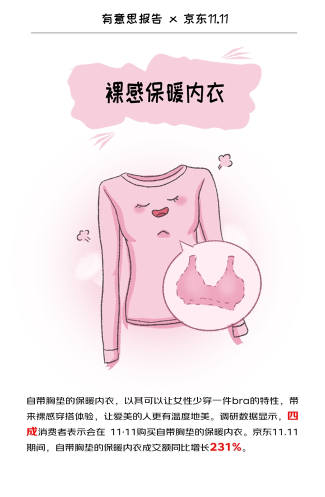 京東11·11期間,自帶胸墊的保暖內(nèi)衣成交額同比增長231%,蕉內(nèi)熱皮502++保暖內(nèi)衣、貓人羊絨蠶絲保暖內(nèi)衣等產(chǎn)品受到消費(fèi)者的青睞。