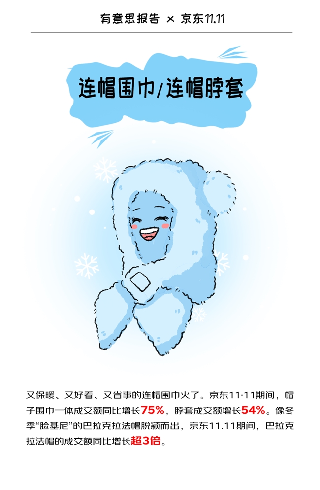 值得注意的是,過去只在登山運(yùn)動、滑雪運(yùn)動中出現(xiàn)的巴拉克拉法帽,如今在既有的保暖功能性基礎(chǔ)上,增加了更多時尚,逐步成為冬日里的時尚保暖“臉基尼”,越來越受消費(fèi)者青睞。京東11.11期間,巴拉克拉法帽的成交額同比增長超3倍,蕉下、始祖鳥、無印良品等品牌推出的單品受到追捧。