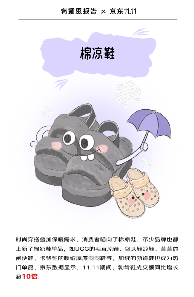 比如,卡駱馳的暖絨厚底洞洞鞋,給洞洞鞋加內(nèi)膽,不少網(wǎng)友直呼:“洞門狂喜,冬天也可以穿洞洞鞋了”;還有UGG的毛茸涼鞋、包頭鞋涼鞋、茸茸休閑便鞋,也讓消費(fèi)者在寒冷的冬日穿出溫暖、穿出時髦味。