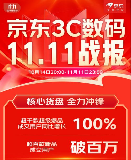 今年的京東11.11憑借“又便宜又好”的消費(fèi)體驗(yàn),成為消費(fèi)者入手 3C 數(shù)碼產(chǎn)品的首選渠道,消費(fèi)熱情空前高漲。京東3C數(shù)碼11.11戰(zhàn)報(bào)數(shù)據(jù)顯示,截至11月11日23:59,超千款超級爆品成交用戶同比增長100%,超百款新品成交用戶破百萬。
