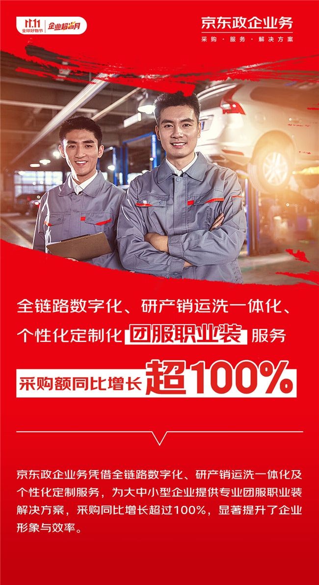 定制服務(wù)也在11.11期間受到了大量企業(yè)的關(guān)注。京東政企業(yè)務(wù)憑借全鏈路數(shù)字化、研產(chǎn)銷運(yùn)洗一體化打造的專業(yè)團(tuán)服職業(yè)裝解決方案,讓采購人不僅可在線添加企業(yè)名稱、LOGO等個性化信息,還可隨時聯(lián)系專業(yè)客服,享受一對一的定制方案設(shè)計服務(wù),實(shí)現(xiàn)一鍵采購下單,一件起定,最快211時效送達(dá)。11.11期間,團(tuán)服職業(yè)裝定制采購額同比增長超過100%。