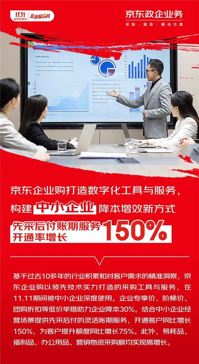 作為京東為中小企業(yè)提供快采購、輕管理、一站式采購服務(wù)綜合平臺,京東企業(yè)購?fù)瞥隽烁黝悓贁?shù)字化工具與服務(wù),助力中小企業(yè)采購“有資金、提效率、享低價”,企業(yè)專享價、階梯價、團(tuán)購折扣等舉措,幫助企業(yè)降低采購成本超過30%。作為特色服務(wù)之一的企業(yè)采購管家在11.11期間服務(wù)的中小企業(yè)數(shù)量同比增長35%。致力于緩解企業(yè)資金緊張、提升經(jīng)營效率的先采后付服務(wù)開通客戶數(shù)同比增長150%。
