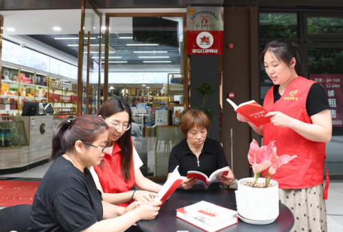 圖為老板娘黃美珍(右二)與香溢志愿者、群眾共同學(xué)習(xí)黨建知識
