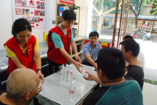 圖為店主傅春明(藍色著裝)主動邀請戶外工作者進店乘涼,為其提供礦泉水飲品
