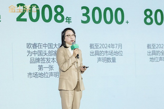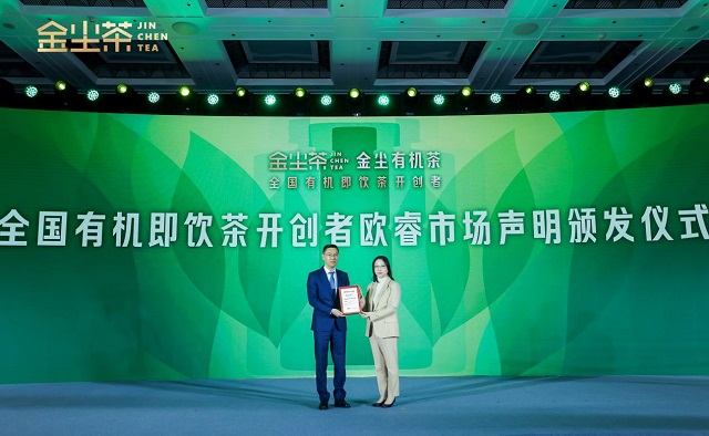 在活動(dòng)現(xiàn)場(chǎng),伴隨著金塵有機(jī)茶新品亮相,歐睿國(guó)際中國(guó)區(qū)總經(jīng)理、高級(jí)咨詢總裁穆愔也上臺(tái)為金塵有機(jī)茶頒發(fā)了“全國(guó)有機(jī)即飲茶開(kāi)創(chuàng)者”的歐睿市場(chǎng)聲明。