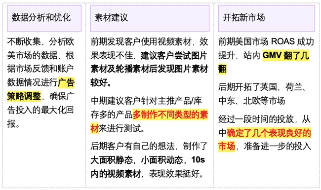 通過魯班跨境通的幫助,SUXXX的GMV在歐美市場取得了顯著的增長,ROI穩(wěn)定在2左右,確保了廣告投入的有效性。廣告宣傳活動獲得ins和FB的粉絲增長,取得了很高的點擊率和轉(zhuǎn)化率。銷售額增長率達到了120%,達成了預(yù)期目標(biāo)??蛻粼跉W美市場建立了穩(wěn)固的客戶群體,用戶忠誠度明顯提高,為品牌在國際市場的持續(xù)發(fā)展奠定了堅實的基礎(chǔ)。這一成功案例為中國女裝品牌在歐美市場的開拓提供了有力的參考。