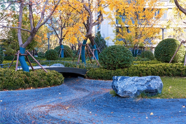 在此基礎上,項目通過增加綠化空間來進一步提升含“綠”量。在單元入戶處,合理增加植物球、小喬木和花喬,提升入戶氛圍感和儀式感,并在單元口設置對稱入戶花箱,增強一層住戶隱私性;在宅間綠化帶,合理布置與新增綠化組團,增加植物種類,提升景觀層次感與觀賞性;在歸家軸線上增加中層北海道黃楊,提升歸家禮儀圍合感;在住宅與圍墻間也新增植物種類,形成層次豐富而美觀的綠化場景。沉浸式漫步其中,可以感受到整個住區(qū)的綠意盎然。