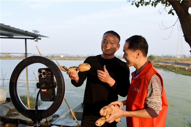 直播過程中,小陳邀請了大房新村的村支書孫書記來到直播間,為大家詳細介紹漢川市的蓮藕。