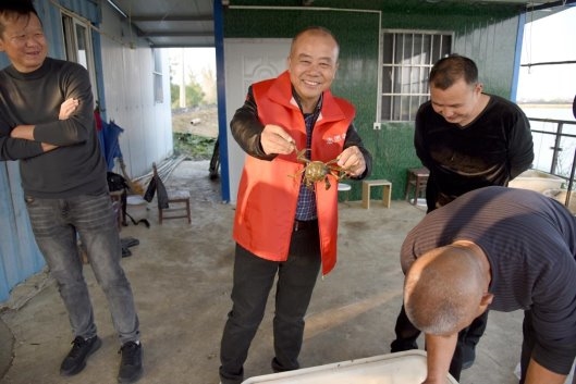 近30畝的螃蟹塘里,志愿者與村民們橫舟水上,用竹竿撐到圍養(yǎng)欄內(nèi),將一袋袋蟹籠慢慢拉起,力所能及的幫助養(yǎng)殖戶做好螃蟹的搬運(yùn)、挑選以及蟹籠的整理?!巴?,這一籠收獲不少呀!”志愿者小楊興奮地喊道,看著蟹籠里一只只活蹦亂跳的螃蟹,他的臉上滿是喜悅。他將蟹籠里的螃蟹小心地倒入船上的盆里,然后又迅速地將蟹籠重新放回水中,繼續(xù)下一輪的收籠工作。