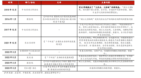 2015年中央農(nóng)村工作會議首提“樹立食物大局觀”,《“十四五”生物經(jīng)濟發(fā)展規(guī)劃》中明確提出發(fā)展合成生物學技術,探索研發(fā)人造蛋白等新型食品,2023年,《求是》雜志上明確指出:“向植物動物微生物要熱量、要蛋白”