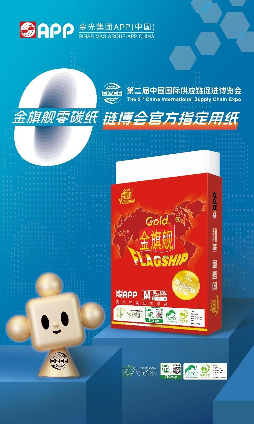 11月26日至30日,在北京舉辦的“第二屆中國國際供應鏈促進博覽會”,“金旗艦零碳復印紙”代表APP辦公用紙,榮幸成為該博覽會官方指定用紙。