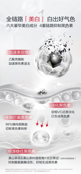 面對“舊的斑點(diǎn)正在淡化,而新的斑點(diǎn)還在生成”的情況,修白瓶更進(jìn)一步,以99%精純煙酰胺切斷黑色素轉(zhuǎn)移,“半路瓦解”黑色素。協(xié)同滇山茶花&滇山茶葉提取物+光甘草定(光果甘草根提取物)的植物成分,抑制黑色素生成。以6大豪華美白成分及4重鏈路助力肌膚健康亮白。