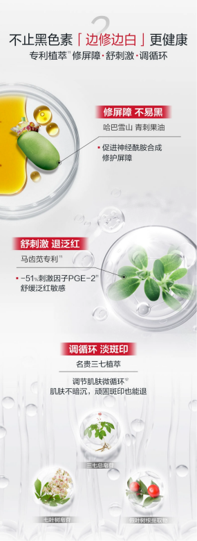 冬季氣候干燥,肌膚非常容易缺水,不少人都曾出現(xiàn)過猛藥美白翻車的問題,而部分敏感人群更是因?yàn)槠琳媳∪醪桓沂褂妹腊桩a(chǎn)品。為此,修白瓶中加入青刺果油來促進(jìn)神經(jīng)酰胺合成,修護(hù)屏障,保護(hù)膚色不易黑。針對敏感期間的皮膚泛紅,還有馬齒莧專利成分舒緩泛紅敏感,名貴三七植萃來調(diào)節(jié)肌膚微循環(huán),由內(nèi)而外消除頑固斑印。