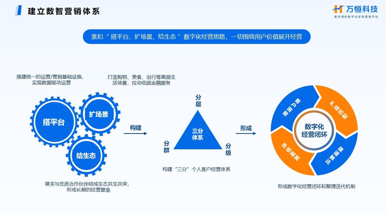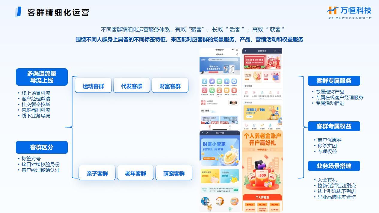 在此趨勢(shì)下,萬(wàn)恒科技在十余載的持續(xù)深耕過(guò)程中,積極推動(dòng)新技術(shù)賦能銀行營(yíng)銷創(chuàng)新,深厚積淀成就了其在智慧營(yíng)銷領(lǐng)域的行業(yè)領(lǐng)先地位,長(zhǎng)期服務(wù)了國(guó)有銀行、股份制銀行以及頭部城商行的智慧營(yíng)銷平臺(tái)建設(shè),點(diǎn)滴實(shí)踐錘煉出一系列盤活存量客戶、觸達(dá)持續(xù)營(yíng)銷的系統(tǒng)實(shí)施經(jīng)典案例。把銀行開(kāi)進(jìn)APP里,讓金融服務(wù)無(wú)處不在,打破時(shí)間、場(chǎng)所、客戶的界限,利用場(chǎng)景化權(quán)益、場(chǎng)景類活動(dòng)、場(chǎng)景“沉浸式”營(yíng)銷,更好地實(shí)現(xiàn)拉新、促活和轉(zhuǎn)化的目標(biāo)。