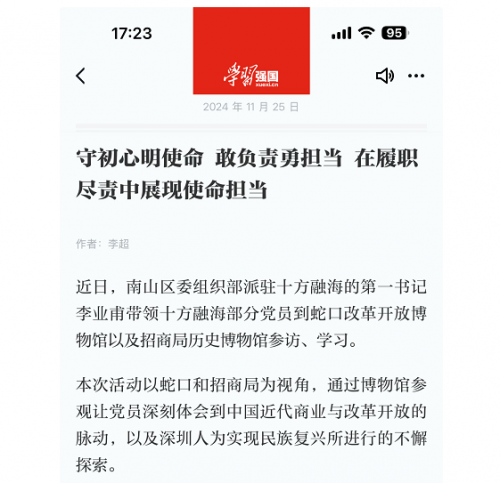 在新時(shí)代的征程中,企業(yè)不僅是經(jīng)濟(jì)發(fā)展的重要力量,更是承擔(dān)社會(huì)責(zé)任、傳承紅色基因的重要載體。近日,南山區(qū)委組織部派駐十方融海的第一書記李業(yè)甫帶領(lǐng)公司部分黨員前往蛇口改革開(kāi)放博物館及招商局歷史博物館進(jìn)行參訪學(xué)習(xí),此次活動(dòng)在學(xué)習(xí)強(qiáng)國(guó)平臺(tái)上獲得了廣泛報(bào)道,成為企業(yè)黨建活動(dòng)的一大亮點(diǎn)。
