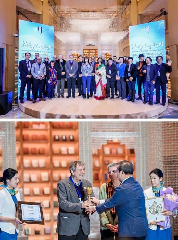 開幕式上揭曉了第九屆上海國際詩歌節(jié)“金玉蘭”詩歌大獎評選結(jié)果,法國詩人讓-皮埃爾·西梅翁榮獲本屆“金玉蘭”詩歌大獎。上海市作家協(xié)會副主席、上海國際詩歌節(jié)藝術(shù)委員會主席趙麗宏宣讀了頒獎詞。西梅翁先生由夫人陪同上臺領(lǐng)獎,上海市人民對外友好協(xié)會會長陳靖、上海市文化和旅游局副局長張旗為西梅翁頒獎。西梅翁隨后發(fā)表了熱情洋溢的獲獎感言,他表示詩歌是開放意識的保證和共同靈魂的基礎(chǔ),是我們?nèi)祟惞餐瑒?chuàng)造出的聲音。這種聲音超越了詩歌所使用的各種語言,也超越了詩歌在各大洲所表現(xiàn)出來的許多令人欽佩的傳統(tǒng)和形式。這種聲音是對事物無限意義的熱切贊美,是人類不斷創(chuàng)造和重塑自我才能的證明。上海國際詩歌節(jié)所秉持的詩歌理念以及賦予他的巨大榮譽,具有不可估量的價值。開幕式上,演員佟瑞欣朗誦了西梅翁的詩作《河流之弦》,語言藝術(shù)家劉家禎朗誦了中國詩人臧棣的詩作《我喜愛藍波的幾個理由》。