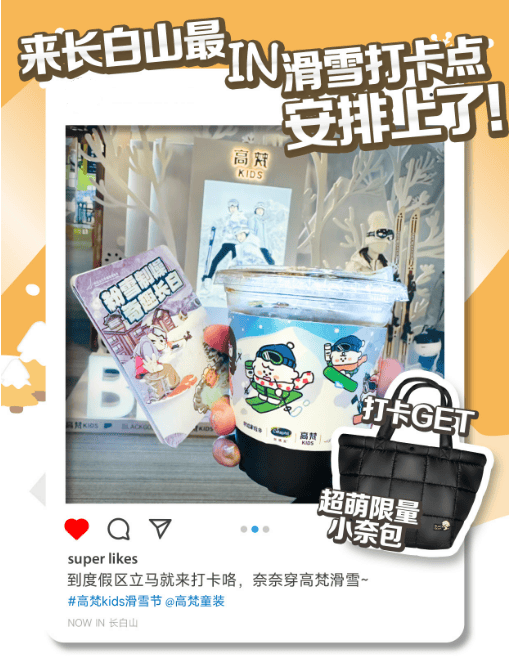 除了打卡點(diǎn)本身的造型可愛有趣外,還有線上線下聯(lián)合打卡送長(zhǎng)白山限定小奈包活動(dòng)。據(jù)了解,這款高梵KIDS和奈娃家族合作的長(zhǎng)白山限定小奈包,是高梵KIDS和奈娃家族為長(zhǎng)白山滑雪節(jié)精心設(shè)計(jì)制作的,不僅外觀萌趣十足,無論滑雪還是日常出行,都是冬日的百搭神器。