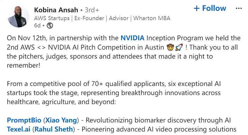近日,由亞馬遜云服務(wù)(AWS)和英偉達(dá)(NVIDIA)聯(lián)合舉辦的AI路演大賽(AWS x NVIDIA AI Pitch Competition)在亞馬遜奧斯汀總部圓滿落幕。此次競(jìng)賽旨在吸引北美地區(qū)快速發(fā)展的AI初創(chuàng)公司,為它們提供一個(gè)向人工智能行業(yè)及風(fēng)險(xiǎn)投資人展示AI前沿技術(shù)應(yīng)用的平臺(tái)。大賽吸引了眾多AI創(chuàng)新玩家參加,來自加利福尼亞州普萊森頓的AI初創(chuàng)新星PromptBio在70多家參賽公司中脫穎而出,成功入圍最后6強(qiáng)。