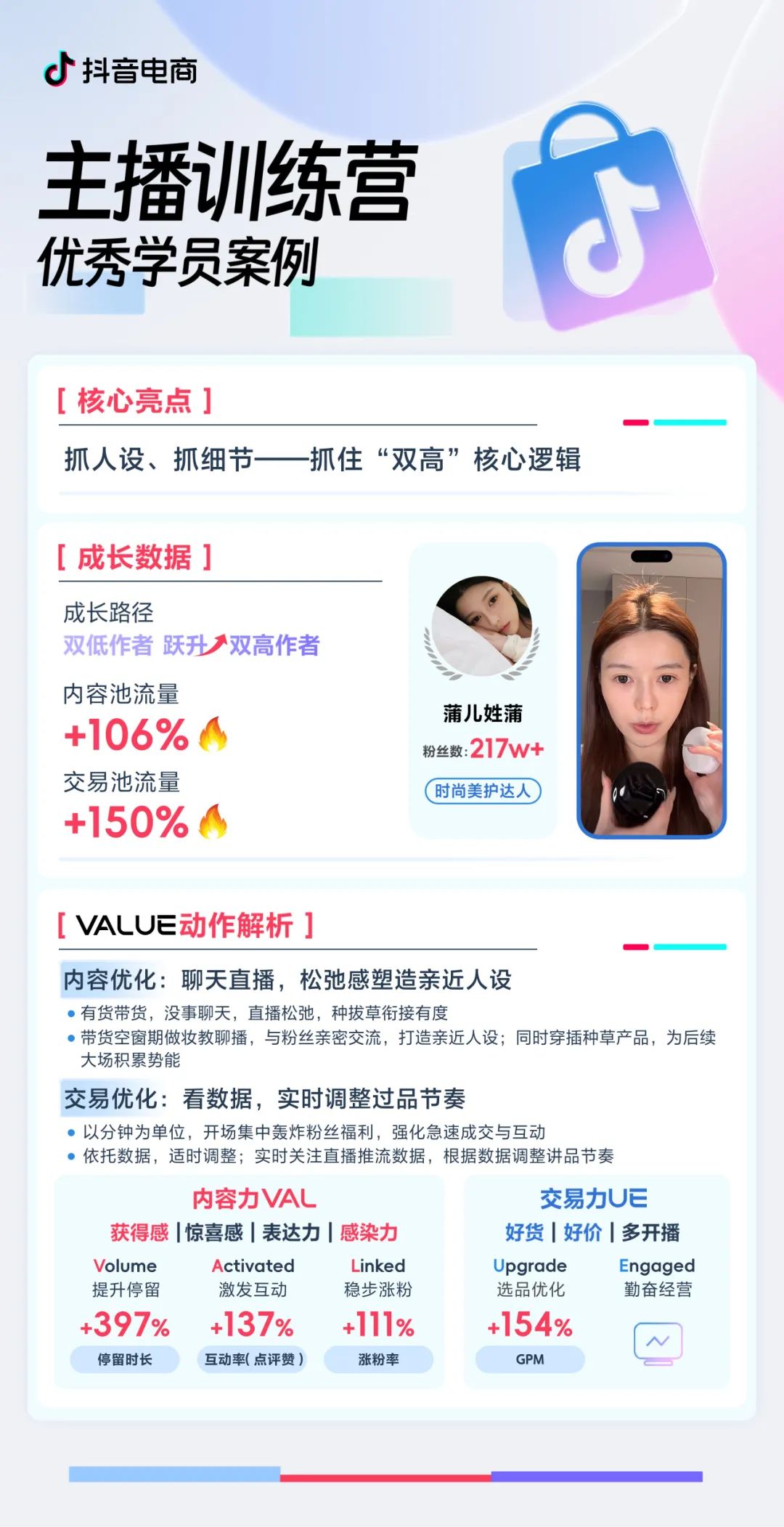 平臺機制升級后,作者們能夠在內(nèi)容池和交易池同時獲得流量。這意味著在抖音電商平臺,生意增長有了更多機遇和可能性,作者們可以同時在內(nèi)容力和交易力上實現(xiàn)新突破。兩位美妝主播@張蝦蝦 和@蒲兒姓蒲 ,結(jié)合其在主播訓(xùn)練營中學(xué)習(xí)的VALUE方法論,將內(nèi)容力和交易力有效配合,快速從雙低作者躍遷為雙高作者。