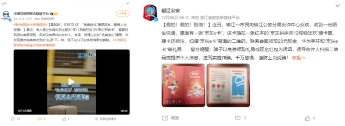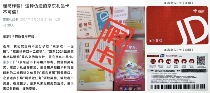 12月6日,京東禮品卡官方微信號發(fā)布《謹防詐騙!這種偽造的京東禮品卡不可信!》的反詐聲明?!拔覀儼l(fā)現(xiàn)有不法分子以京東雙十一促銷、京東拼拼雙十二促銷、京東2024政府家電補貼活動等名義偽造卡片,冒充京東禮品卡/京東E卡/京東超市卡向用戶郵寄,假借刮獎兌獎、贈送小禮品等形式,誘導(dǎo)用戶掃描卡片背面印制的二維碼進入仿冒的‘京東客服’聊天窗口,之后逐步引導(dǎo)刷單做任務(wù)領(lǐng)取獎勵,騙取客戶資金。在此提示,京東從未組織此類活動,請大家切勿輕信,謹防受騙。”