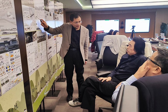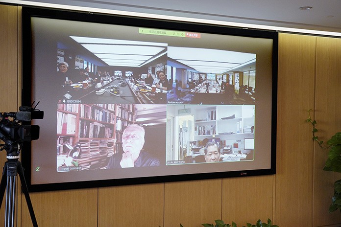現(xiàn)場評審專家組與馬來西亞漢沙楊建筑師事務(wù)所創(chuàng)始人楊經(jīng)文(右下)、荷蘭代爾夫特理工大學(xué)教授Peter Luscuere(左下)等國際專家連線討論