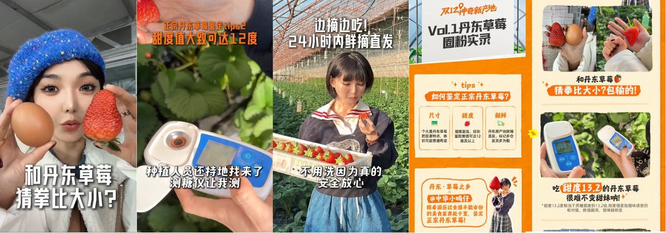 活動(dòng)期間,淘寶新產(chǎn)地為不同類型的原產(chǎn)地好貨打造了“新故事”。例如近年來水果界的“頂流”丹東草莓,冬天一到,全國的吃貨都在等那顆草莓。為了讓消費(fèi)者買到更高品質(zhì)、價(jià)格更優(yōu)的丹東原產(chǎn)地草莓,淘寶新產(chǎn)地聯(lián)合頭部美食達(dá)人遠(yuǎn)赴丹東探訪,為消費(fèi)者鑒定原產(chǎn)好貨。期間,#丹東草莓到底為啥能長這么大#、 #為什么大家都愛吃丹東草莓#等官方話題,登陸微博熱搜榜。