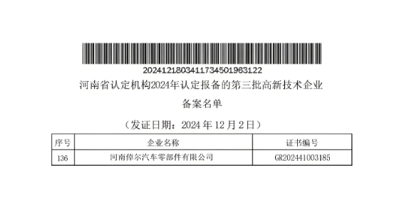 近日,河南倬爾汽車零部件有限公司成功獲評(píng)“高新技術(shù)企業(yè)”,證書(shū)編號(hào)為GR202441003185。這一榮譽(yù)不僅體現(xiàn)了企業(yè)在技術(shù)創(chuàng)新和科研實(shí)力方面的深厚積累,也標(biāo)志著公司正式邁入國(guó)家重點(diǎn)支持的科技型企業(yè)行列,將為其高質(zhì)量發(fā)展注入強(qiáng)勁動(dòng)力。
