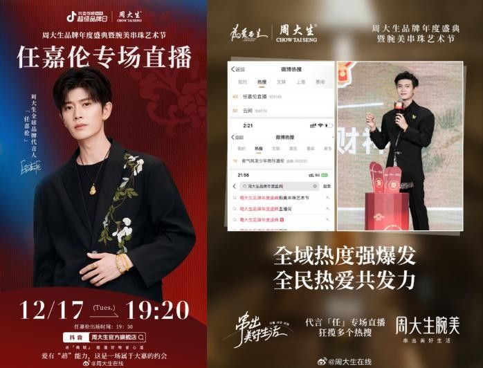 同時,周大生將此東方色藏匿于寶藏時刻當中,開啟了《周大生品牌年度盛典暨腕美串珠藝術節(jié)》專場直播,實現(xiàn)全域熱度爆發(fā),狂攬微博、抖音平臺等多個熱搜。