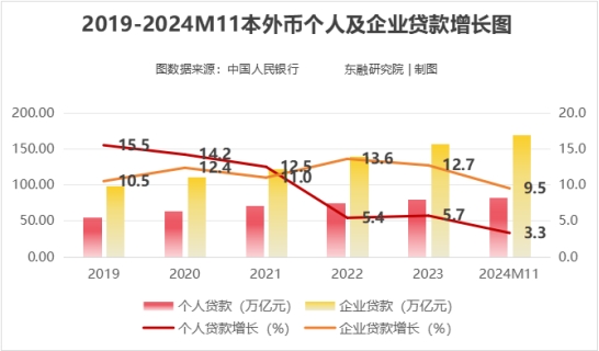 從貸款結(jié)構(gòu)來(lái)看,2024年11月末,個(gè)人貸款余額82.47萬(wàn)億元,同比增長(zhǎng)3.3%,增速比上年同期低3.5個(gè)百分點(diǎn);企事業(yè)單位貸款余額169.25萬(wàn)億元,同比增長(zhǎng)9.5%,增速比上年同期低3.9個(gè)百分點(diǎn)。